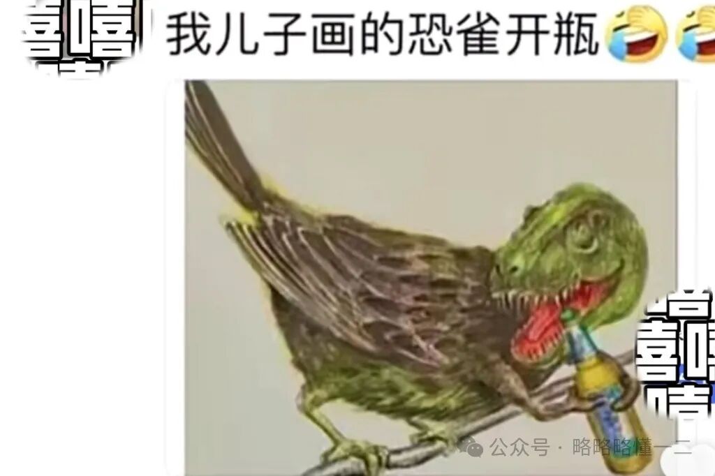 无独有偶,还有家长分享了儿子画的《恐雀开瓶》,看这幅画的短短几秒钟出现了好几次的反转。