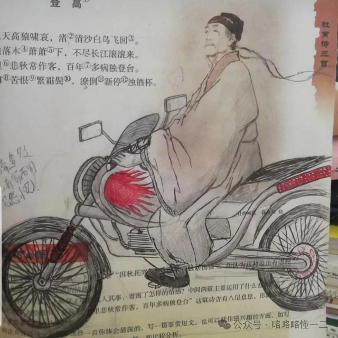 杜甫给加上了摩托车,看起来真的是浑然天成,没有违和感,线条自然流畅,关键是能想到给杜甫加个摩托车也是不容易了,杜甫可以骑着摩托车风驰电掣了。