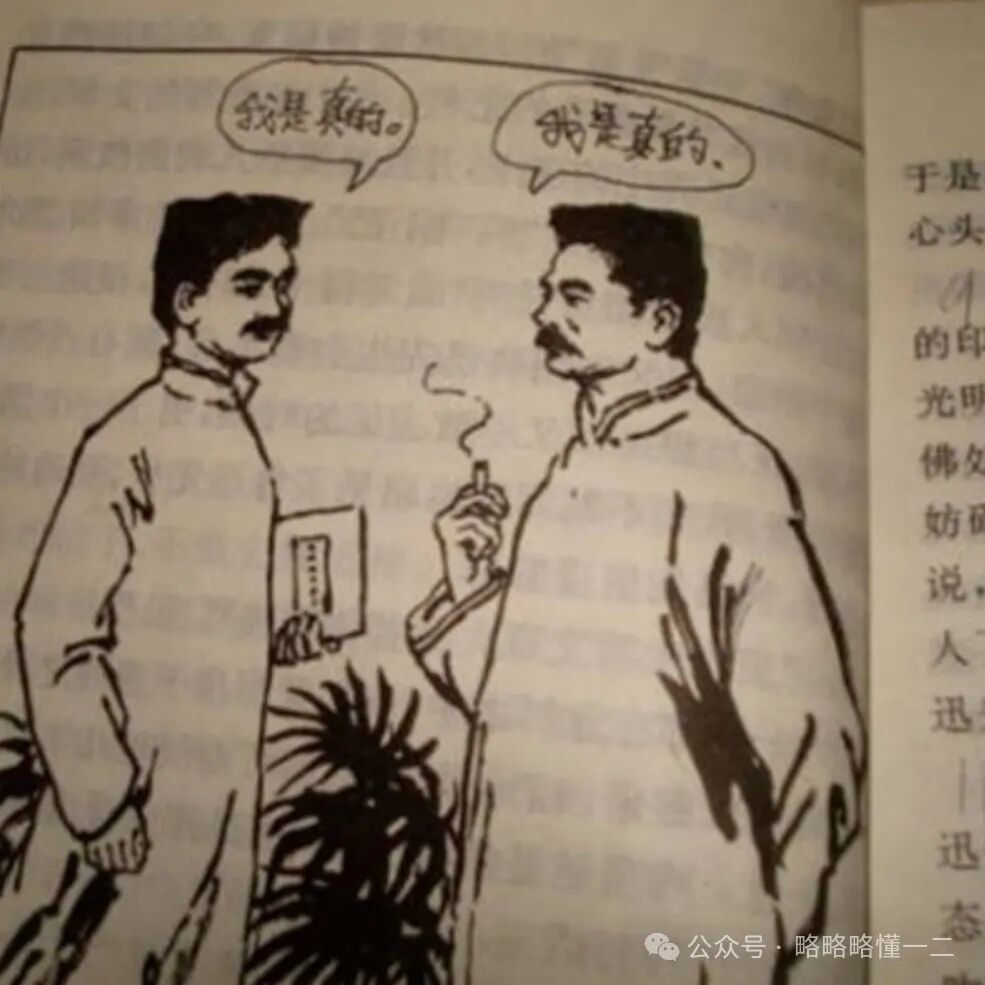 还有同学画了两个鲁迅,两个鲁迅互相在说自己是真的,大家能看出来谁是真的吗?