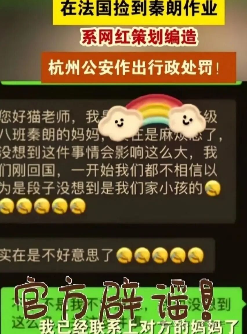 公安机关介入调查了,这下真相大白,警方通报“在法国巴黎拾到小学生秦朗丢失的作业本”这则视频,涉嫌传播网络谣言,也就是说整件事情都是子虚乌有的,属于摆拍行为!