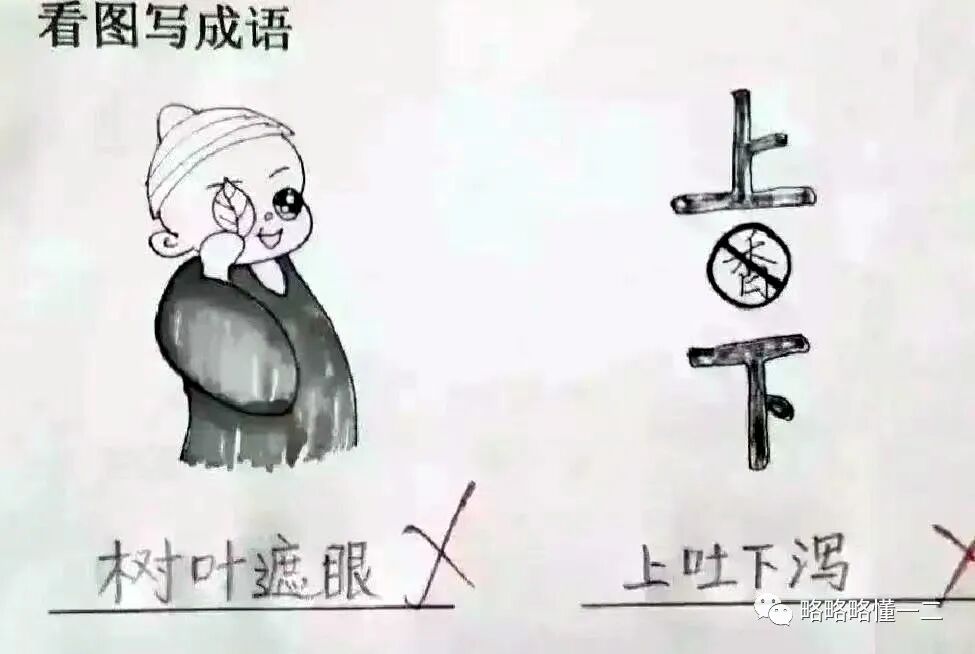 可对于小学生而言他可能就会从图片表面直接给写出来了,树叶遮眼,上吐下泻。