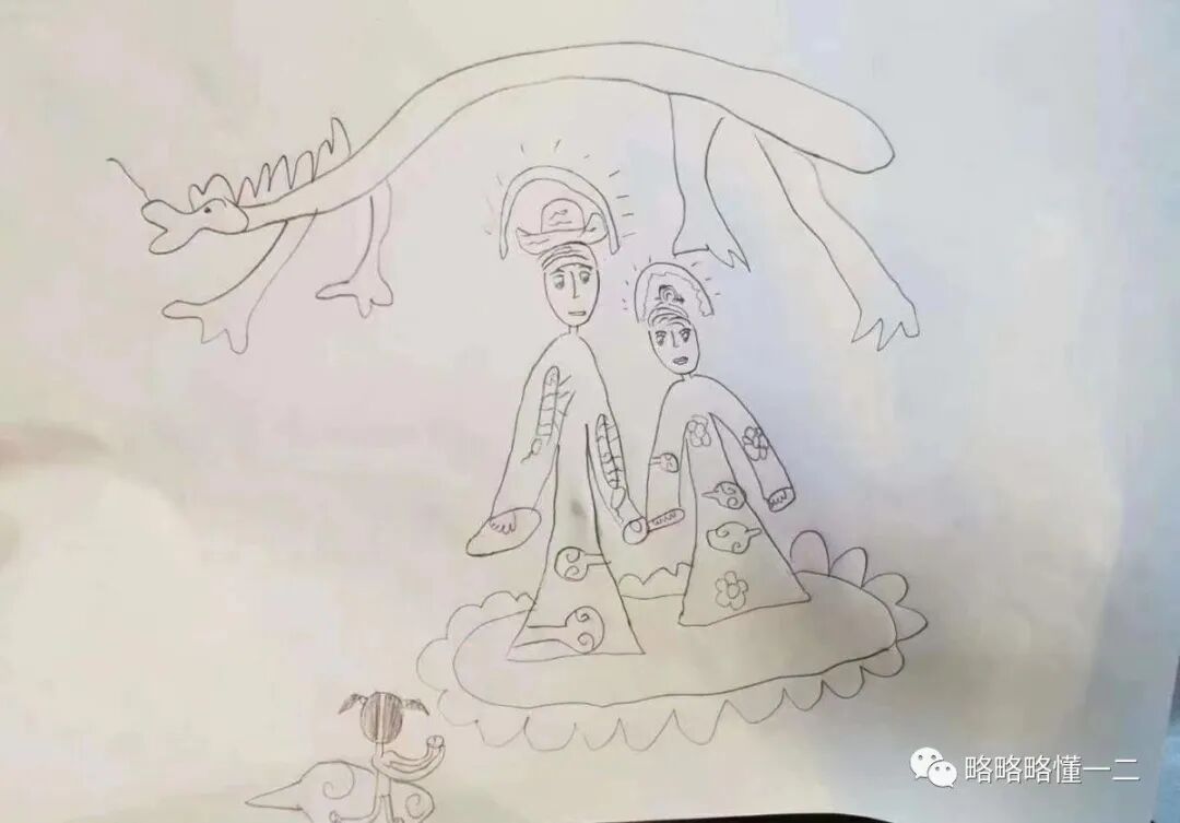 上面一条龙,下面是新郎官和新娘子站在不知道是云还是花上面,下面有一个小孩好像是站在云上面,不知道各位猜出来没有,欢迎在评论区讨论。