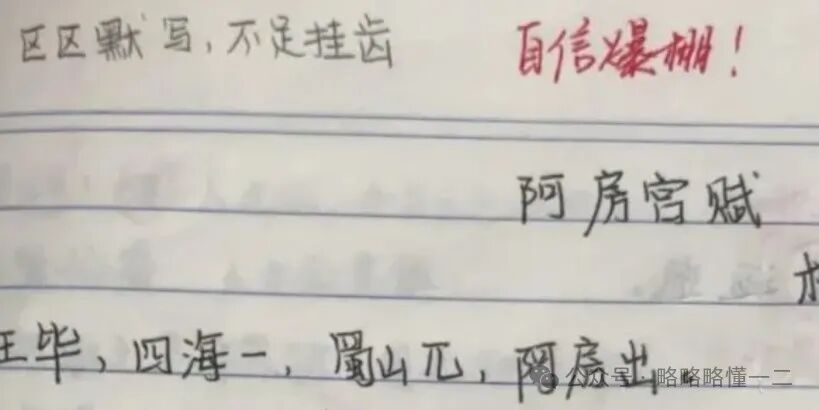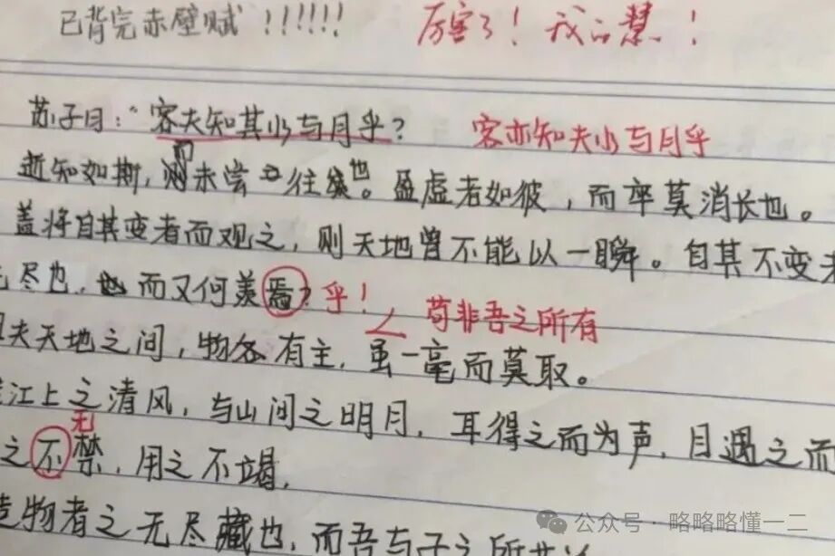 这名同学背完了《赤壁赋》,在作业里告诉老师,并且把同学们写错的地方一一改正过来了,虽然有不少写错的地方,可老师仍然鼓励地说:“厉害了我的慧!”
