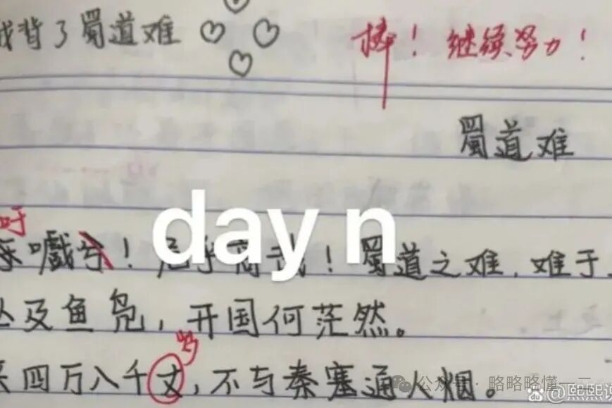 这名同学《蜀道难》的默写中同样也把错误的地方用红笔改正,并且给老师先留言:我背了《蜀道难》,画了一堆爱心,看得出来这名同学满满的成就感。