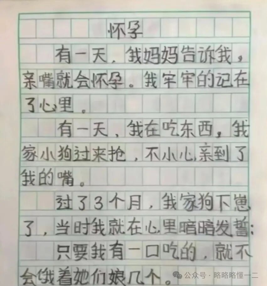 再看这名小孩哥的作文内容有些荒谬,但这也不能赖小孩哥,因为妈妈告诉他亲嘴就会怀孕,于是在一次不小心中,亲到了狗狗,随后不久狗狗就怀孕了,3个月后生下了狗崽。