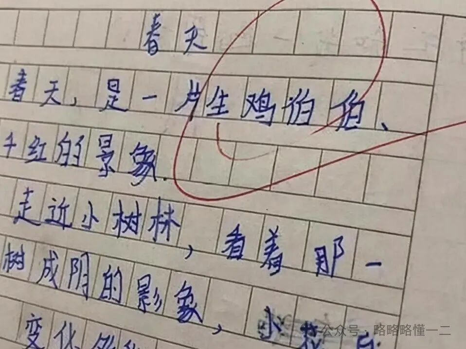 小学生本来想写春天生机勃勃,结果写成了“生鸡伯伯”,该说不说该伯伯的压力不小。