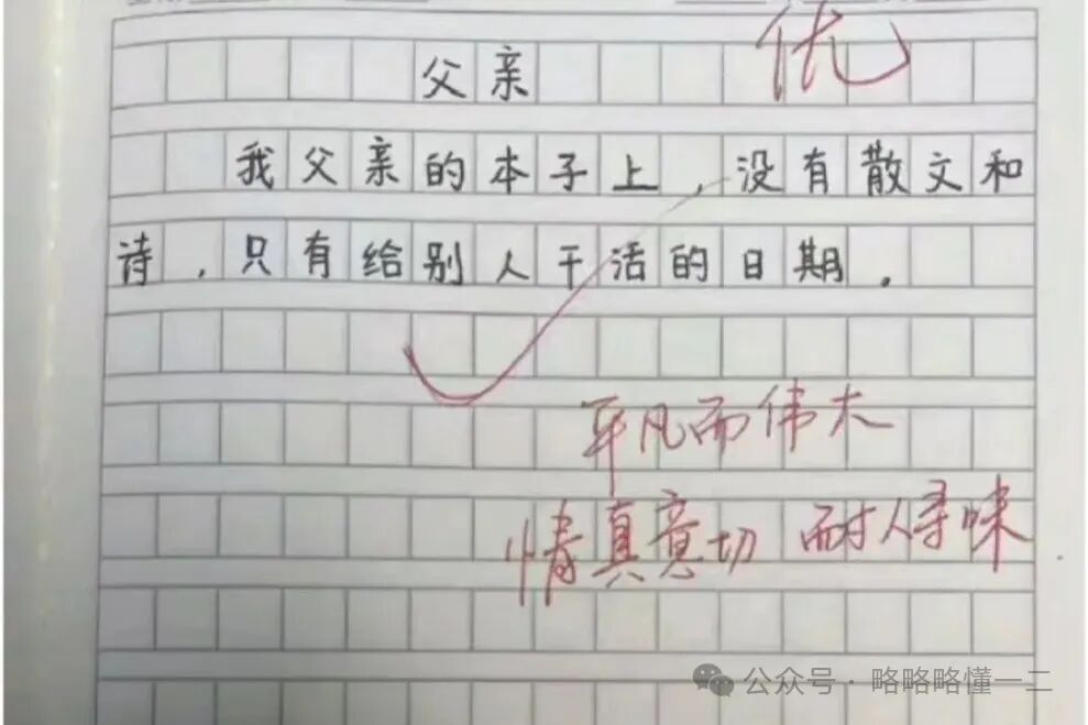作文上写着:“我父亲的本子上,没有散文和诗,只有给别人干活的日期。”短短两行却写尽了生活的辛酸和不易,父亲支撑一个家庭的不易。
