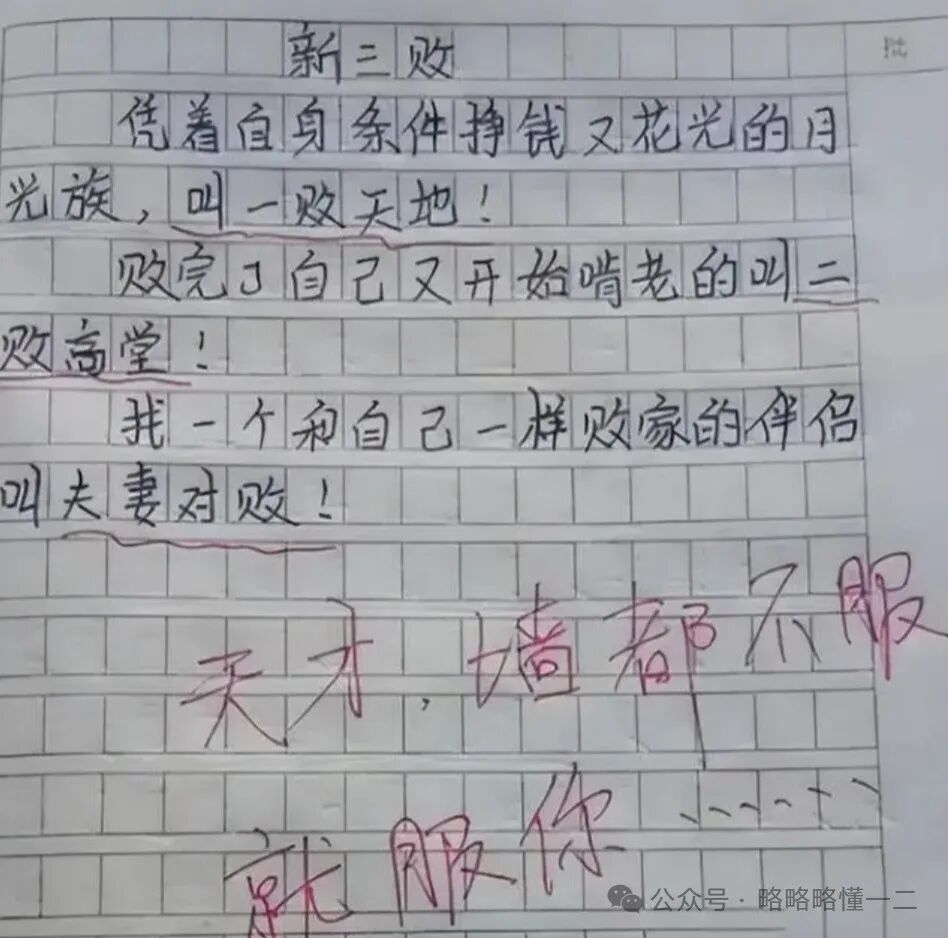 小学生总结的“新三败”,一听是真的有道理,首先第一败是自己有能力挣钱但又月光的人,叫“一败天地”。败完了啃老的叫“二败高堂”,找一个和自己一样败家的伴侣叫“夫妻对败”。