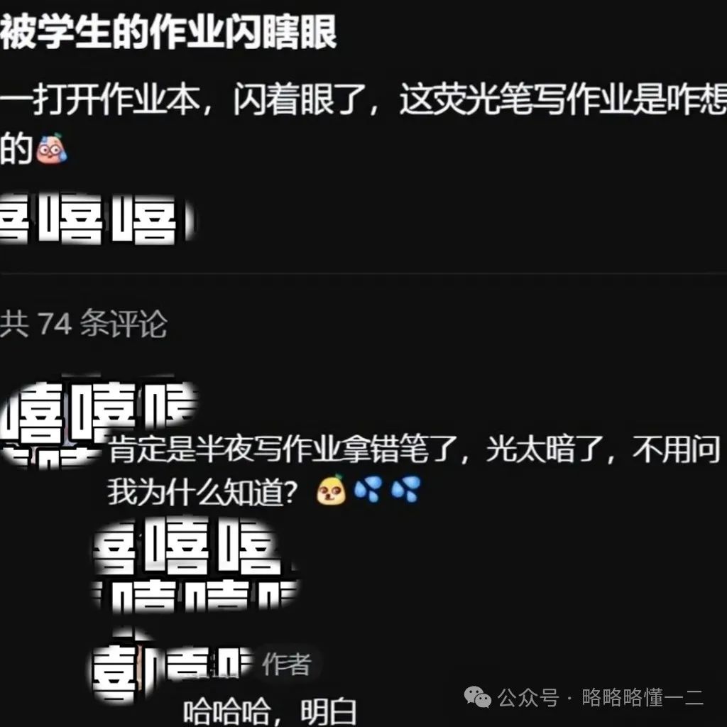 笑笑也觉得出现这种情况,可能是小学生熬夜赶作业拿错笔了,他甚至有可能觉得晚上赶作业太黑了,用荧光笔增加一下亮度。