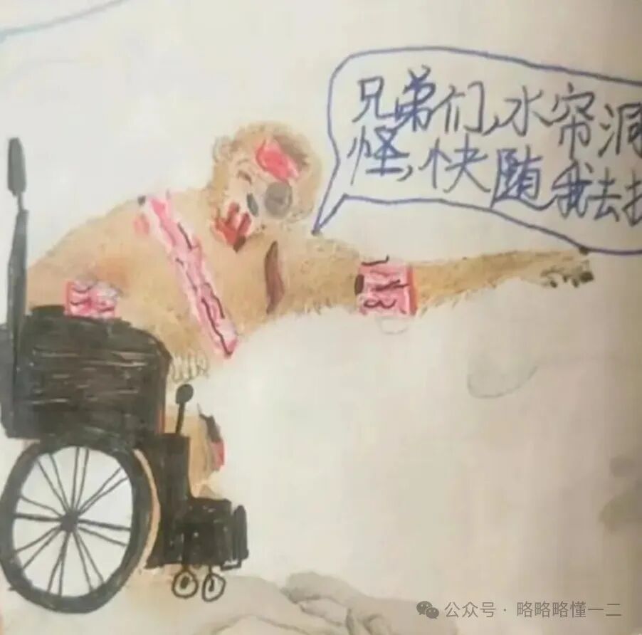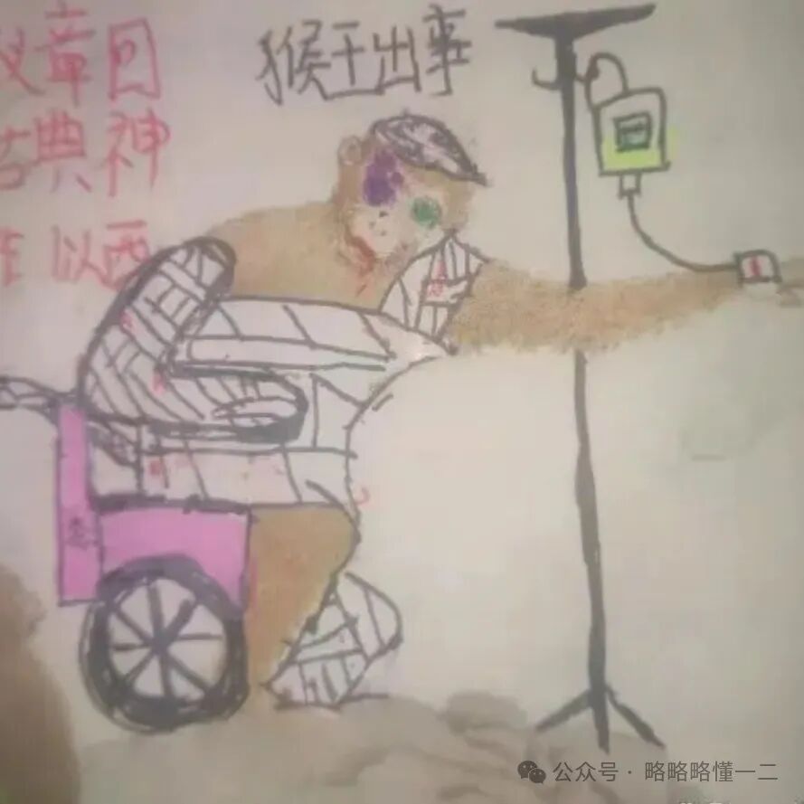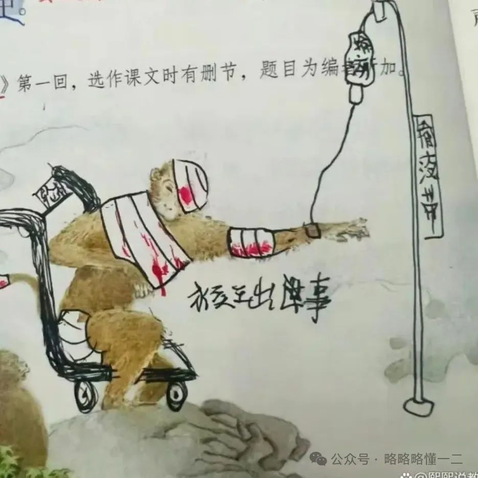 活泼好动又聪明伶俐的猴王在学生笔下成为了坐在轮椅上,身上缠有纱布还打着吊瓶的猴王,一副可怜兮兮的样子,这哪是《猴王出世》,简直就是《猴王出事》。
