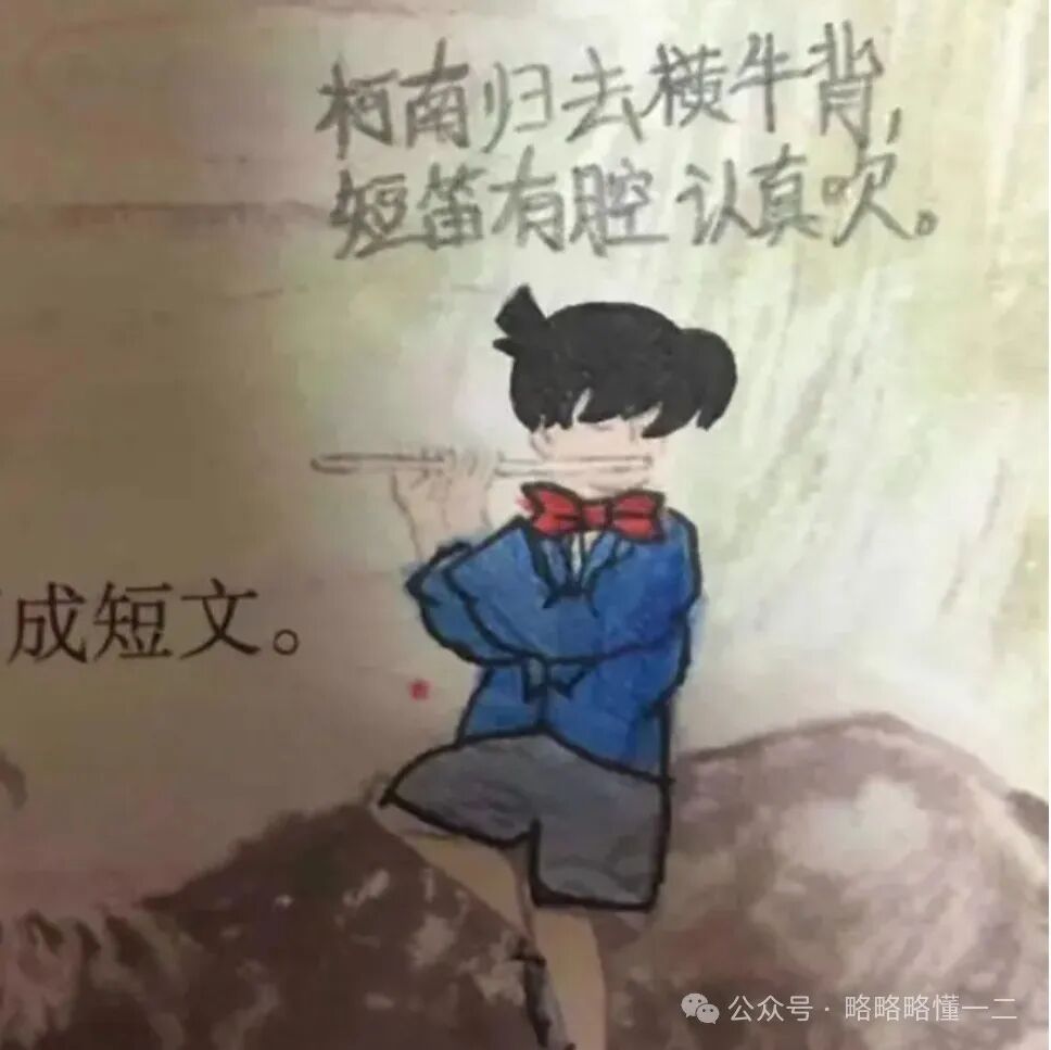 同学们的想象力无穷无尽,思路清奇,比如袁枚的古诗《所见》中给配的牧童骑黄牛的图,非常恬静属舒适的一张图,没想到被学生涂鸦成柯南的样子了。