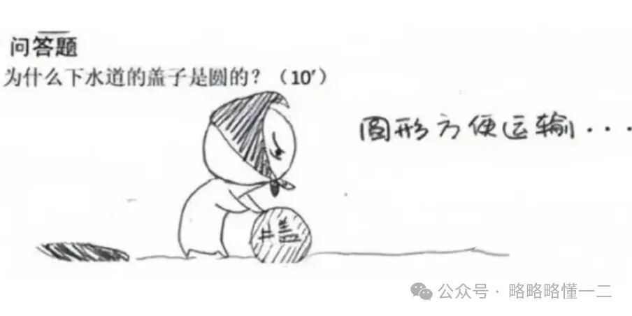 还有一道题问小学生为什么下水道的盖子是圆的?小学生机智回答说圆形方便运输。