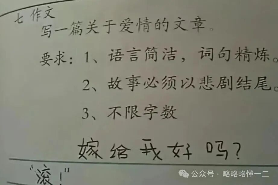 小学生轻易就满足了这两个要求,而且两句话就解决。一句话是“嫁给我好吗?”第二句斩钉截铁地回复:“滚!”果然是语言精简又悲剧结尾。