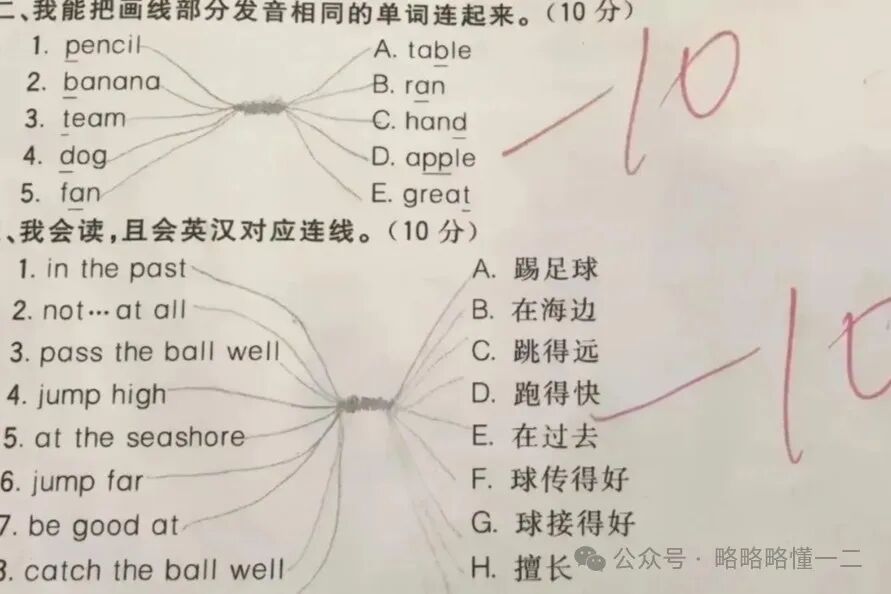 小学生做英语连线的题找到了万能答案,那就是所有的线都在中间汇合,连线毕竟也没要求是直线,可这不算作弊吗?当然逃不过老师的眼睛。