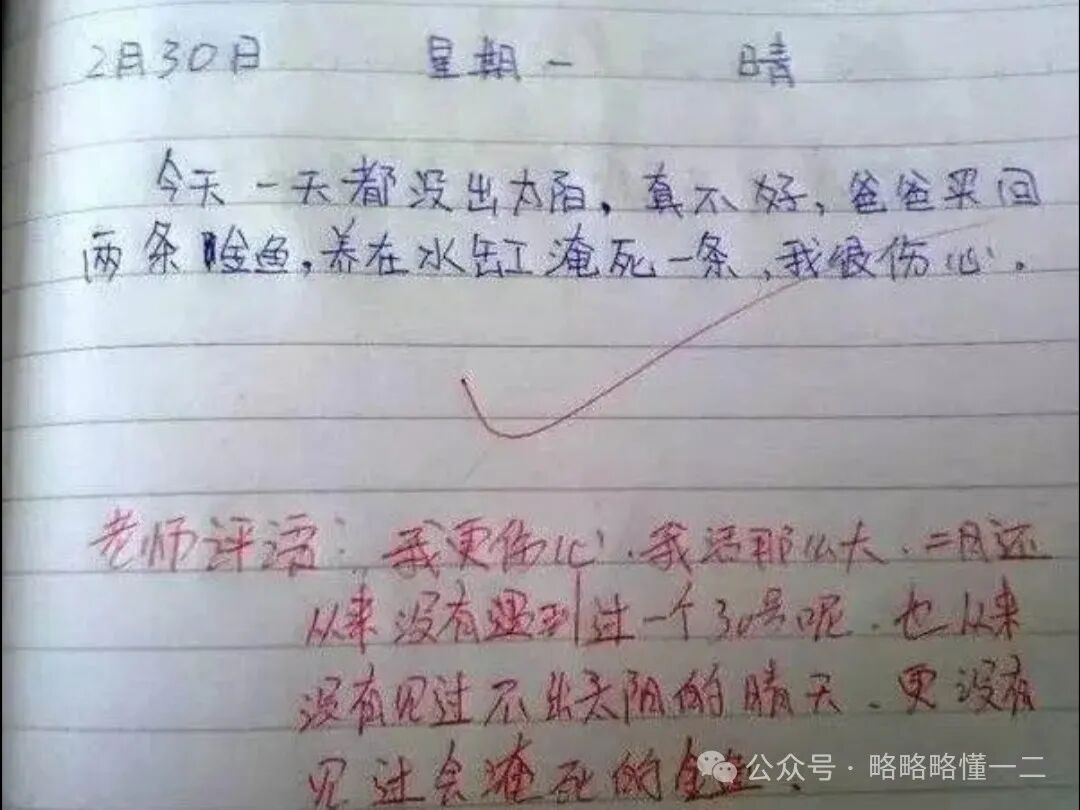 老师评语里说自己更伤心,没遇到过一个二月有30号,也没有见过不出太阳的晴天,更没有见过会淹死的金鱼,看来编也得看技术。