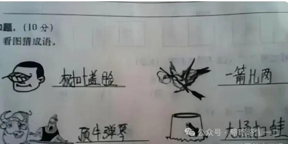 老师看到这些成语后不禁在心里想:那我这几年的语文白教了呗,劳动成果在小学生身上是一点没体现出来。