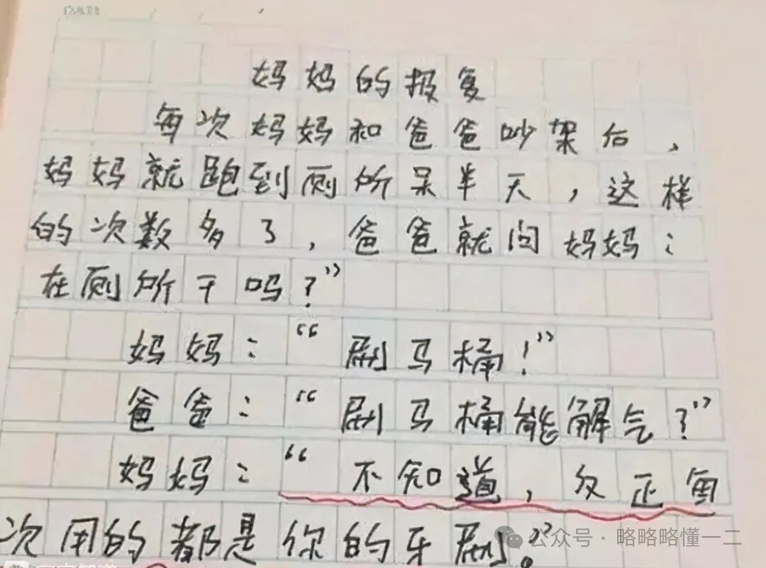 如果这篇作文被妈妈看到了,难免会引起一场家庭战争,而爸爸什么都没做,好像就躺枪了,似乎已经解释不清了。老师,你看这事儿办得!