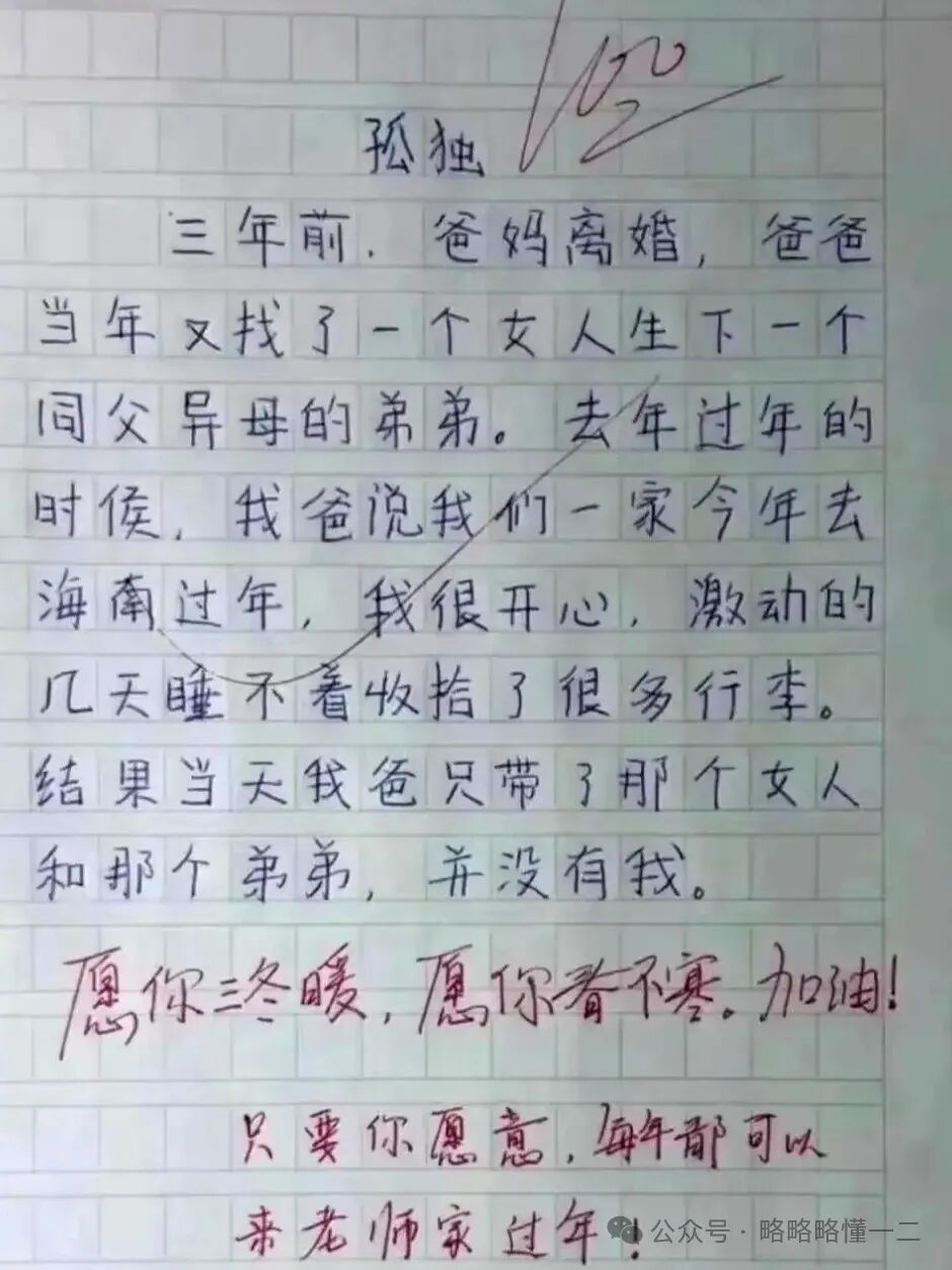 小学生在作文中写了父母离异后自己的生活,当他得知过年去海南的时候,他激动到好几天都睡不着,还收拾了行李,最后爸爸带了继母和同父异母的弟弟去了,自己是局外人。