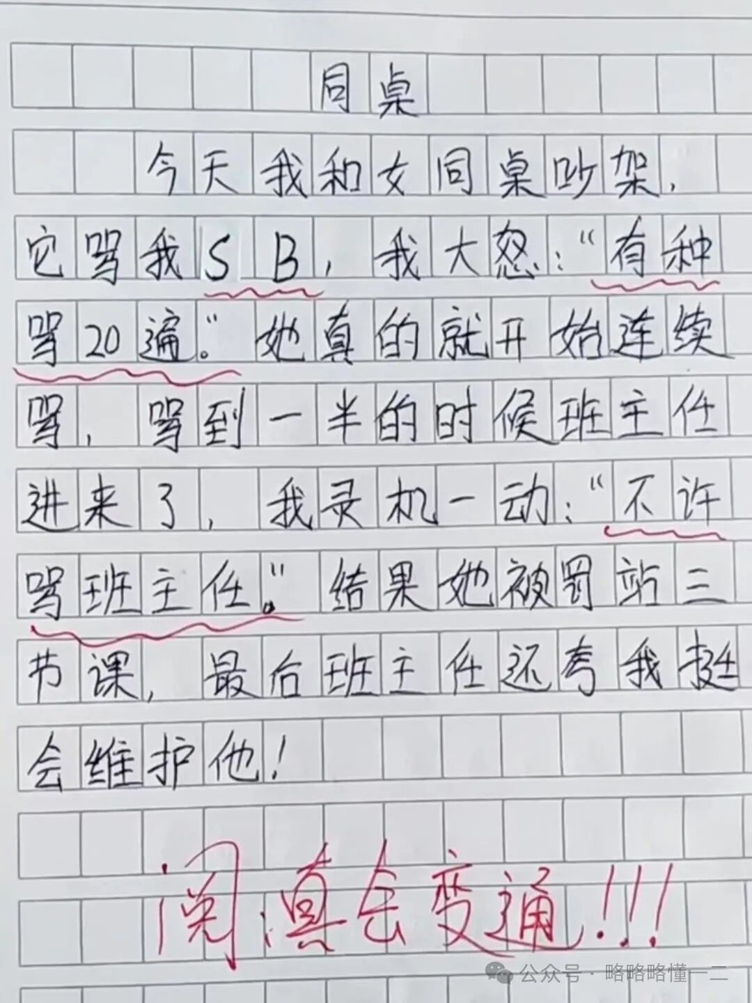 小学生在作文中记录了这样一件有意思的事,和同桌吵架,同桌说了一句很难听的话,小学生听后正面刚,还要同桌说20遍,大概是知道老师要来了。