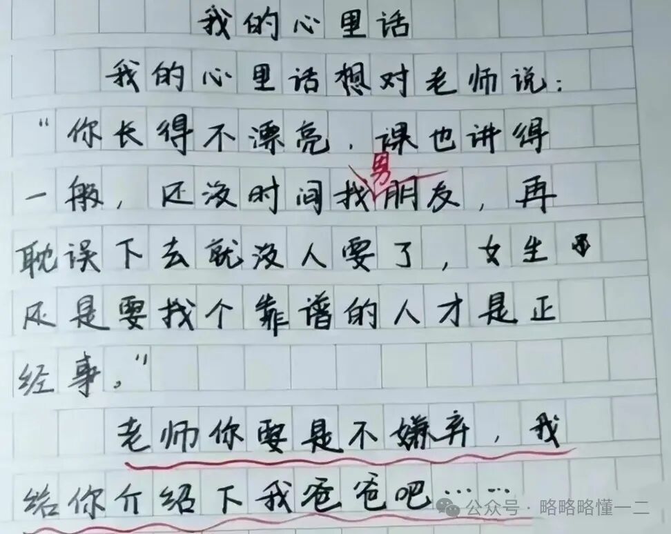 小学生的这篇作文叫《我的心里话》,开头估计就能让老师震惊,小学生说老师长得不漂亮,课也讲得一般,这是可以说的吗?不是说心里话吗?