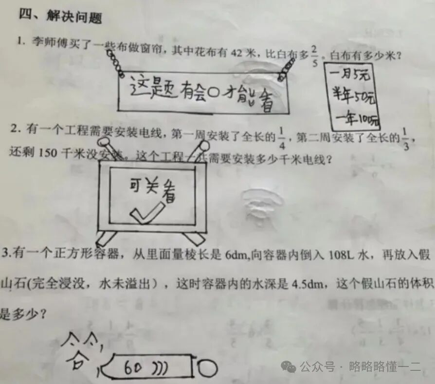 第二道应用题小学生画了电视的图,告诉老师想知道答案需要解锁看广告,老师:平时看剧最烦的就是看广告解锁了,怎么批个卷子也得看广告呢?