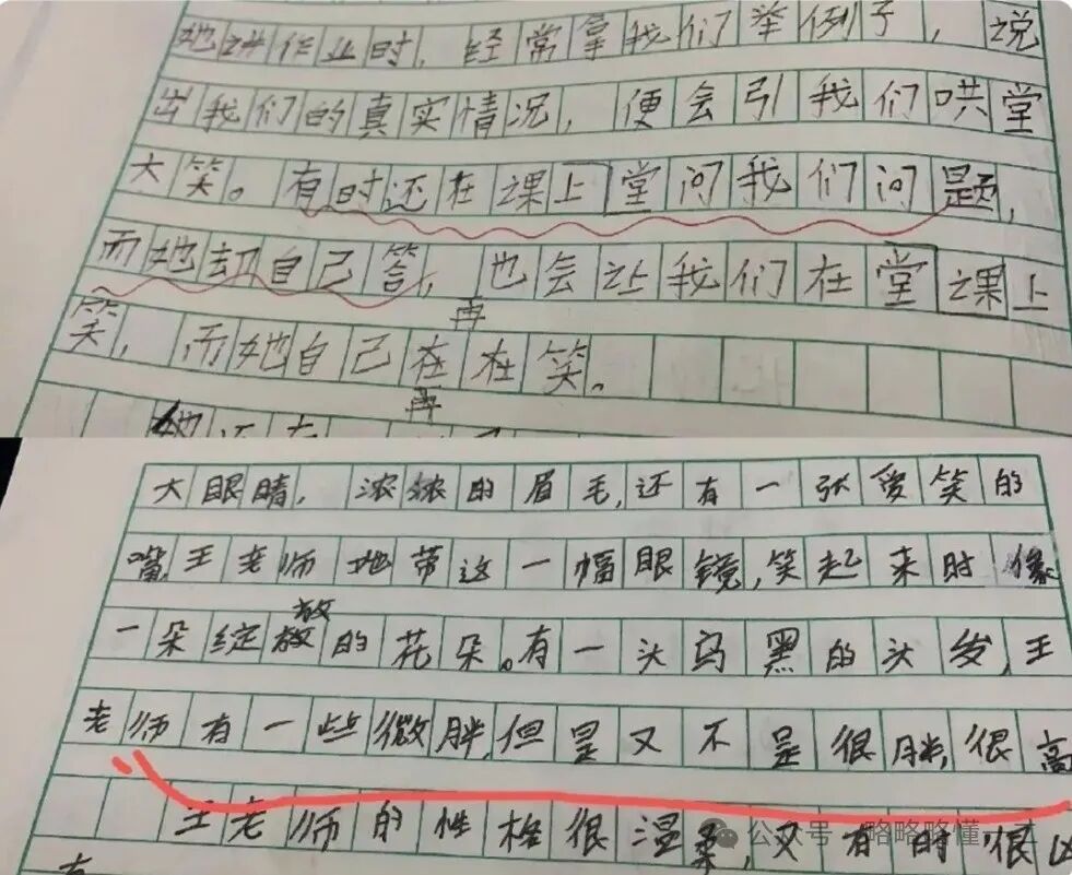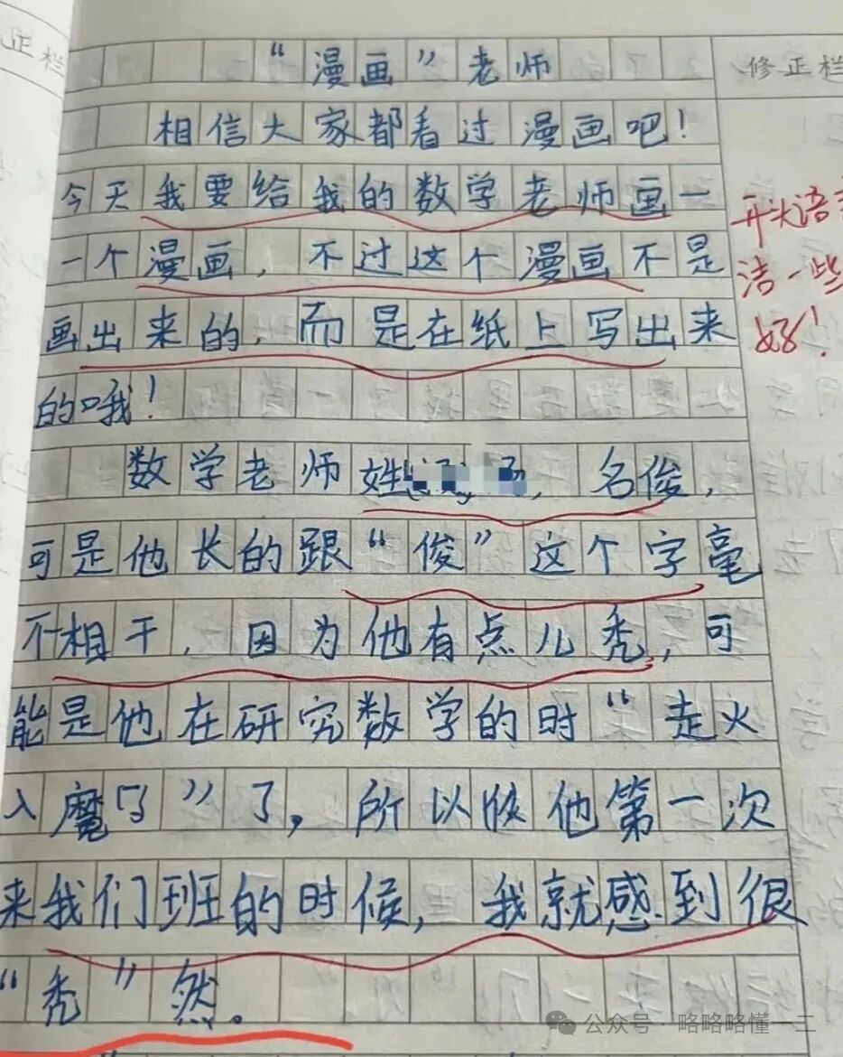 小学生写作文还有专门扎老师心的,说数学老师名字里有个“俊”字,但他长得和“俊”字毫不相干,老师看了得多难受啊!