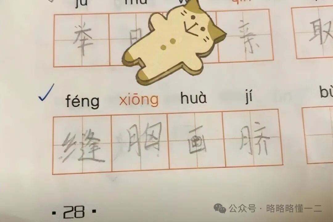 还有的小学生拼音能力让人堪忧,拼音拼不出来,题里让写“逢凶化吉”,小学生把“ji”的音拼成了“qi”,于是就变成了“缝胸化脐”。或许是川渝地区的孩子,从小都说肚鸡眼儿。