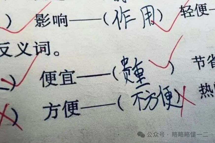 就比如反义词填写这道题,也是小学的经典题型,问“方便”的反义词,小学生随手写上“不方便”,让人笑疯了,这么小就懂得拒绝了,还知道“不方便”。