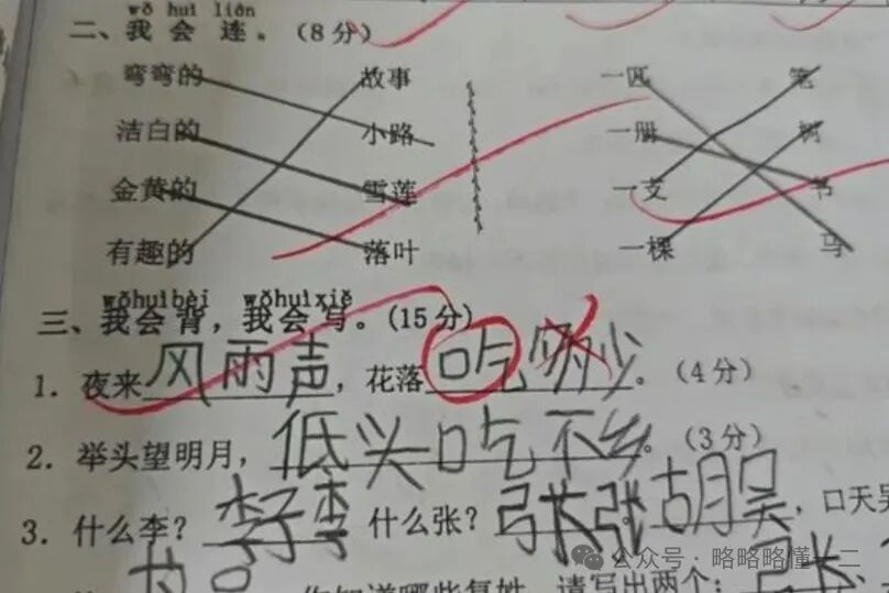 也有想法简单的小学生,一心全都在吃上,古诗填空:夜来风雨声,花落知多少,到小学生那里就变成了“花落吃多少”了。