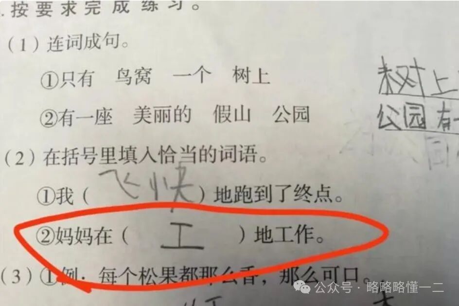 比如这道题问妈妈在什么样地工作,都有”地”了,很明显让填动词,小学生来了个名词,变成了“妈妈在工地工作”,也真是服了。