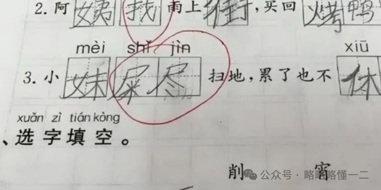比如这道题让补全完整的话是“小妹使劲扫地,累了也不休息”,本来小妹挺认真努力干活的,没想到让小学生把“使劲”写成了“屎尽”,这么写妹妹知道吗?