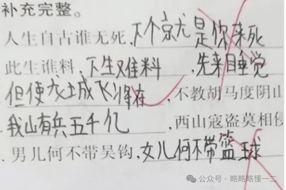 比如问“男儿何不带吴钩”下一句,小学生随手一写,“女儿何不带篮球”,这都是哪跟哪啊。