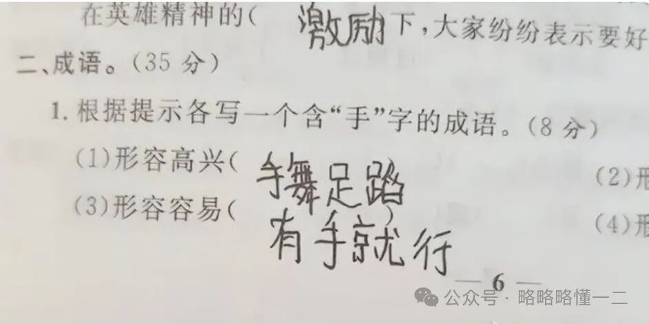 在试卷中根据题意让写带有“手”字的成语,形容高兴写的是“手舞足蹈”,这个写的倒是合理靠谱。接下来就离谱了,让写形容容易的成语,小学生一想就来:“有手就行”。