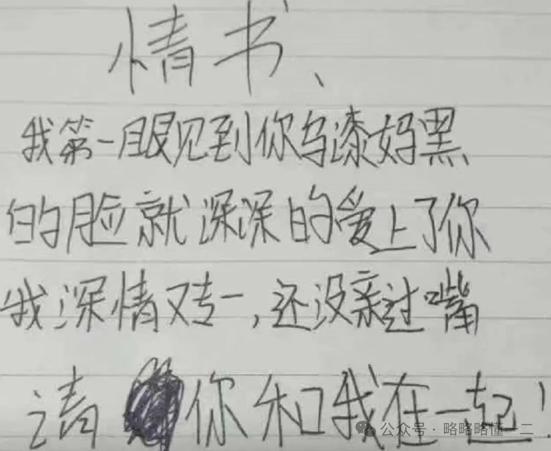 小学生太有才了,在情书中说第一次见到她乌漆嘛黑的脸就喜欢上了她,还说自己深情又专一,还挺会宣传自己。