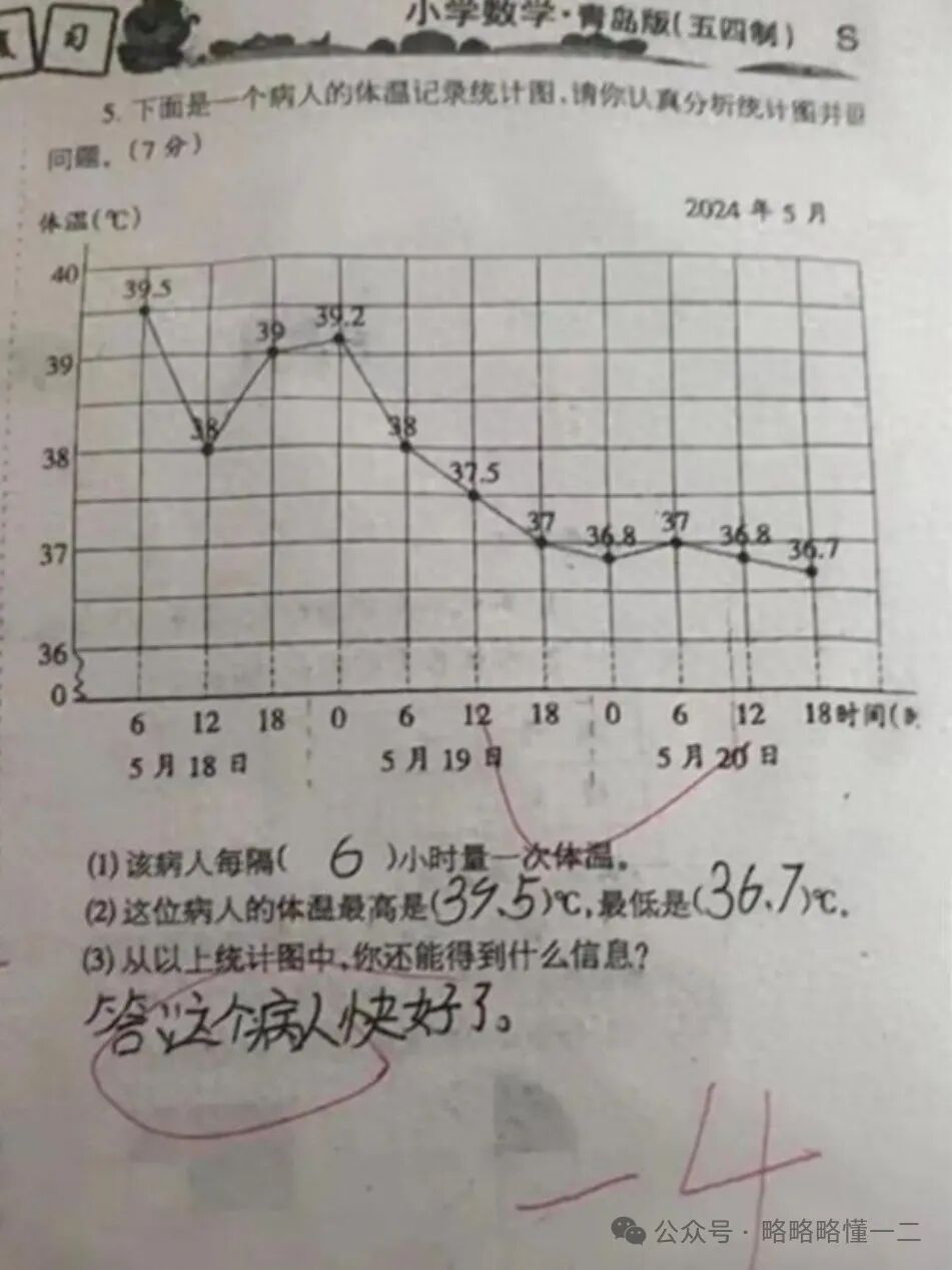 这道数学题是和体温统计图相关的,一位病人三天的体温统计图,最后一个小问问的是统计图中还能得到什么信息?依稀记得笑笑当年上小学的时候也做过这样的题。