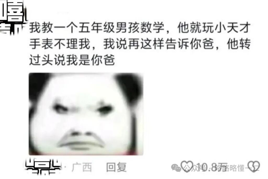 于是大学生就想着“搬出”小学生的爸爸来震慑一下他,说再这样的话就告诉他爸爸。小学生随后转过头来说:“我是你爸!”