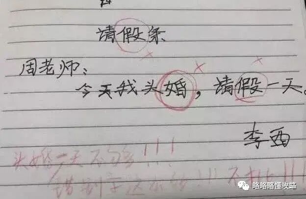 法定结婚年龄是男22岁,女20岁。小朋友你这么小才上小学就头“婚”了,你让大龄单身青年情何以堪!你的请假条还是变相请帖咯,老师这还得给你送份子钱啊?但你头婚请一天假,也不够啊!请婚假,至少也要7天嘛,那么多事情要操办。好吧,老师也知道你是头昏,写错字了。那就罚抄错别字100遍!
