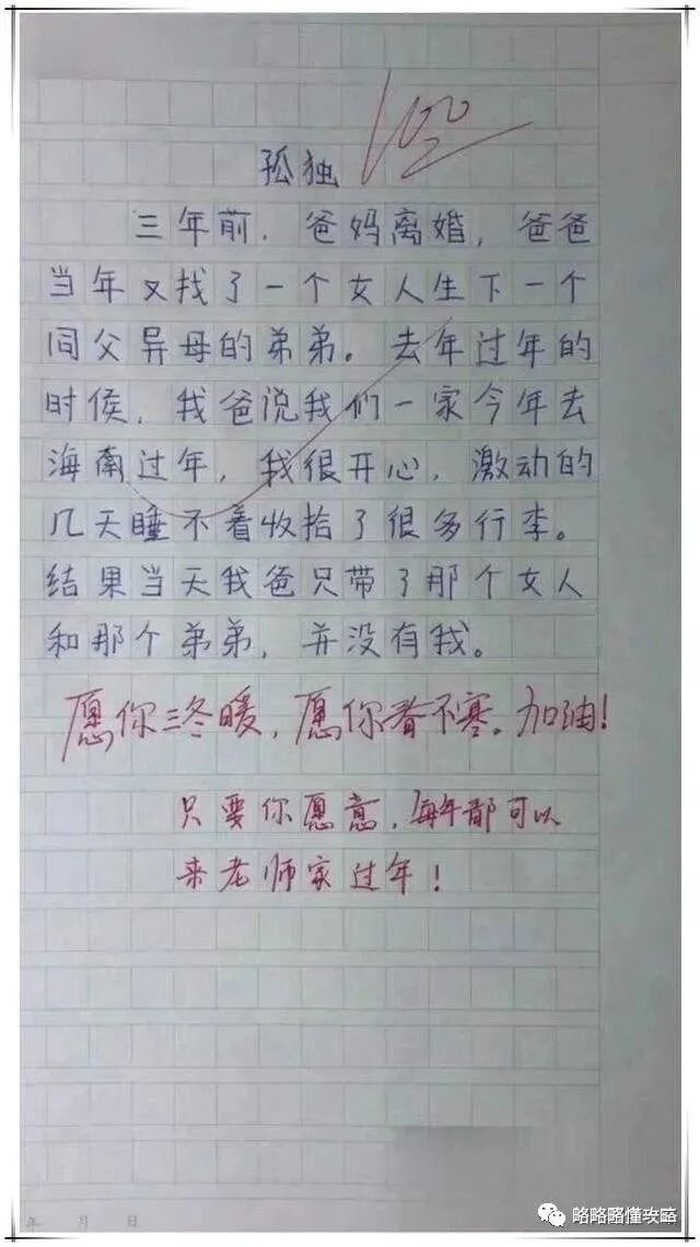 就这100个字,全文没有提到“孤独”两个字,看完作文却让人实在是心疼孩子。