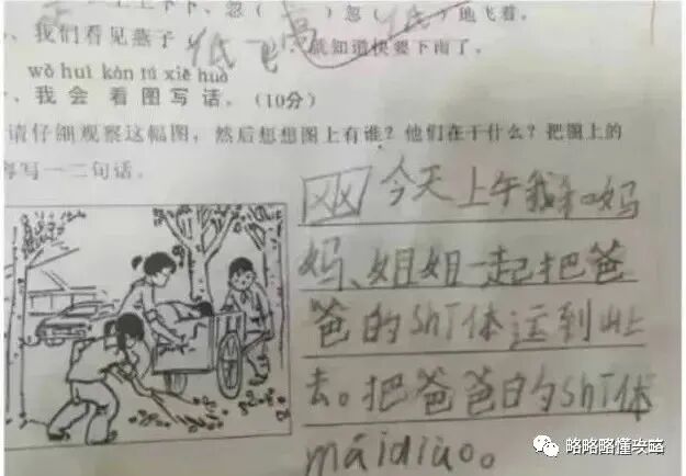 现在小孩子真是啥大实话都往外说。这可是看图说话呀,你就这么简单的七个字就写完了?