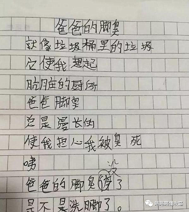 多么朴实天真的话语,多么真挚的情感表现。寥寥几行字就将爸爸的“罪行”写得淋漓尽致,文中充满了对爸爸脚臭的抗拒和自己生活环境的恶劣,同时又表现出了自己的万分委屈。