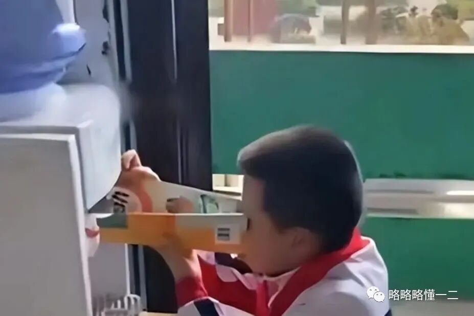 也许是这一天他没有带水杯,于是用书微微卷起来放到饮水机下作为引流,然后用嘴接着喝水,小学生还是有一定智慧的,起码教材的封面不会因为水而湿透。
