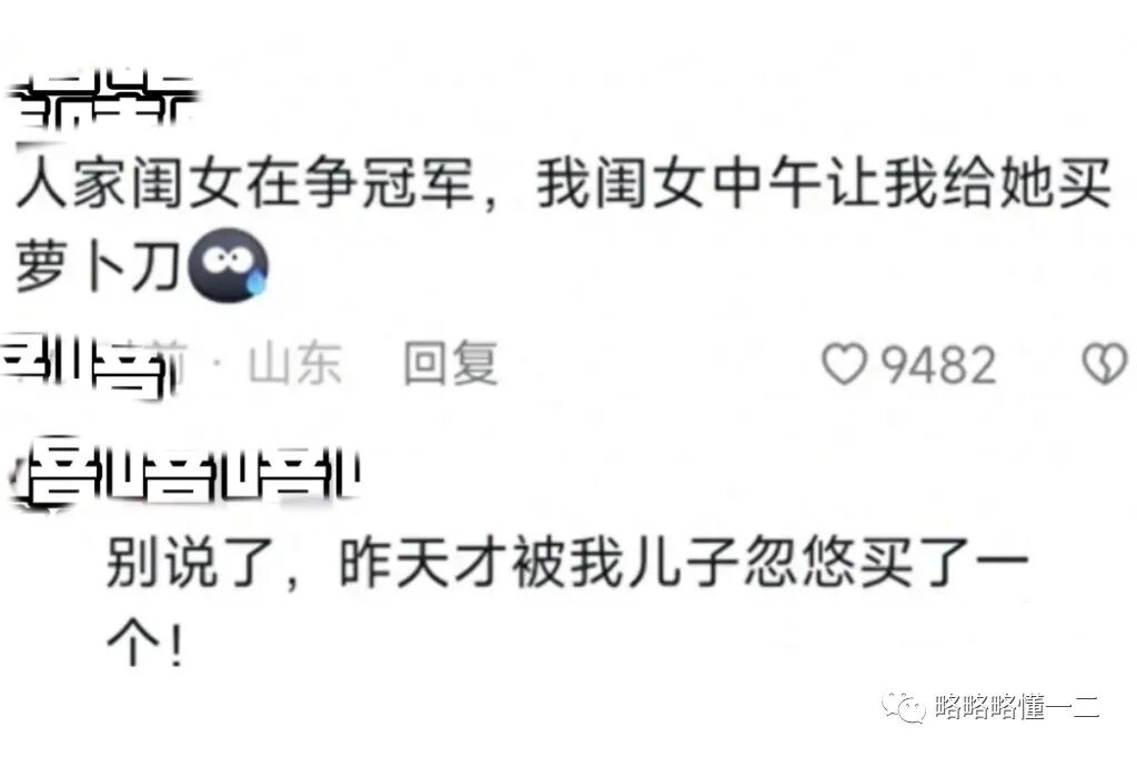 家长说人家13都拿亚运冠军了,自己的女儿中午让她给买“萝卜刀”,最近这个“萝卜刀”确实是很火,不少家长都给孩子购买了,几乎达到了人手一个的程度。