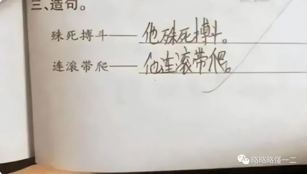 叫他用“殊死搏斗”造句,好家伙!直接加一个字就造完了,“他殊死搏斗”。