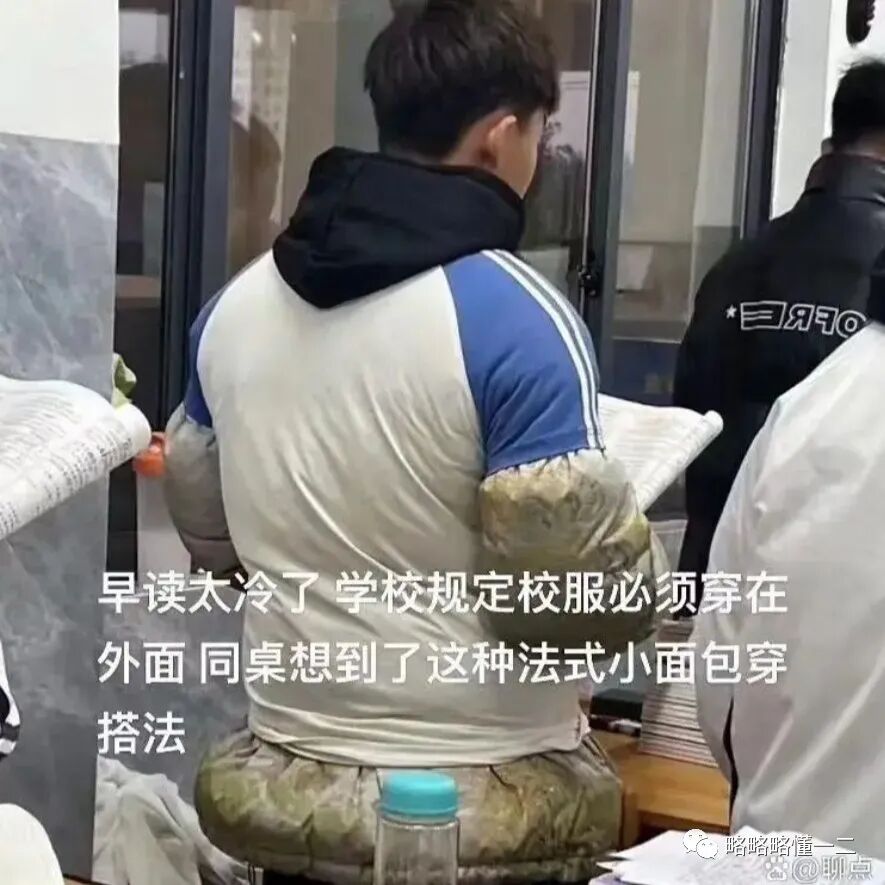 校服本来是很宽松肥大的,里面穿上棉衣后就好像硬塞在里面似的,撞脸表情包,老师一抬头看见底下都是“小面包”一样的孩子,老师怎么做到不笑的呢?