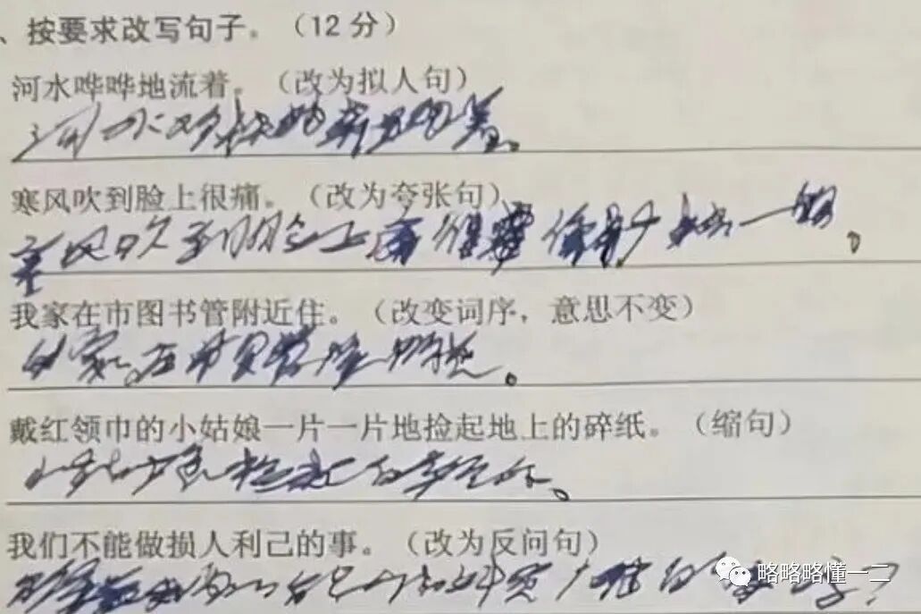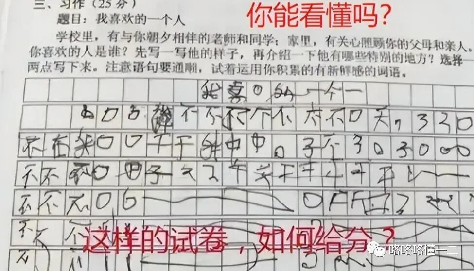 还有小学生小小年纪就已经学会“草书”了,写作文太抽象了,都是圈圈勾勾的,老师怎么识别呢?这样的卷子真是为难老师,小学生的作文略显敷衍。