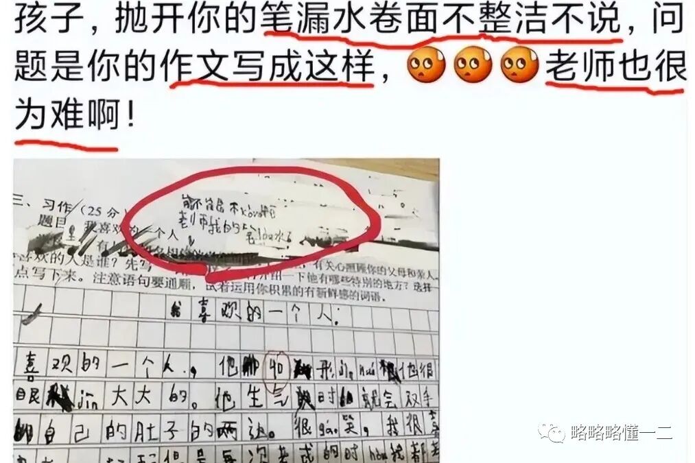 老师也在网上说了这件事情,老师表示抛开你笔漏水弄脏卷面的事情不说,就是作文写成这样,老师也很为难啊!
