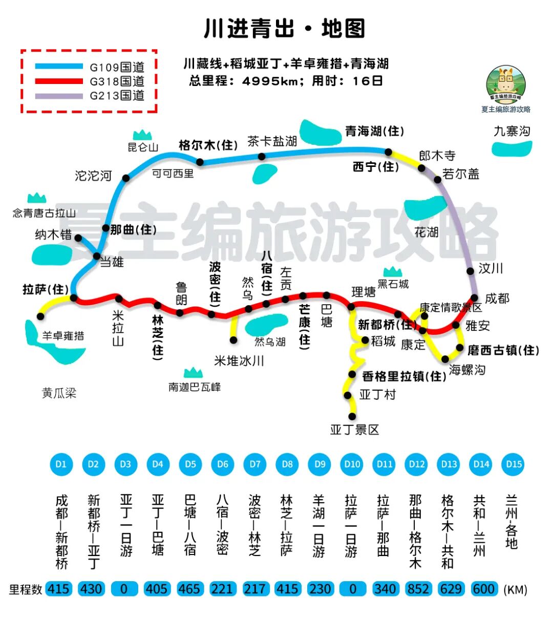 2、川进青出自驾西藏最经典的线路,沿318川藏公路进入拉萨,从四川盆地穿越横断山脉、青藏高原,抵达“地球第三极”西藏拉萨,看世界最险峻俊秀的雪山峡谷;回程时沿109青藏线、214甘南线,体验昆仑山、可可西里与洛克之路的绮丽多姿。15日自驾行程安排:成都→新都桥→亚丁→(稻城亚丁)亚丁村→巴塘→八宿→波密—林芝→拉萨→(羊卓雍措)拉萨→那曲→格尔木→青海湖→兰州。