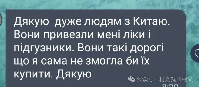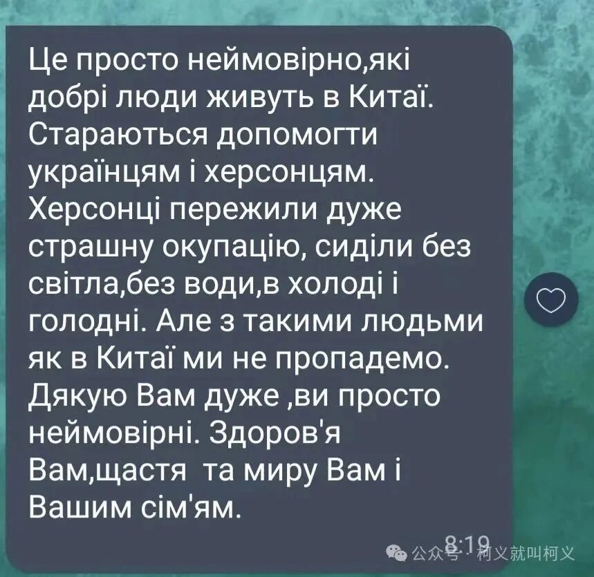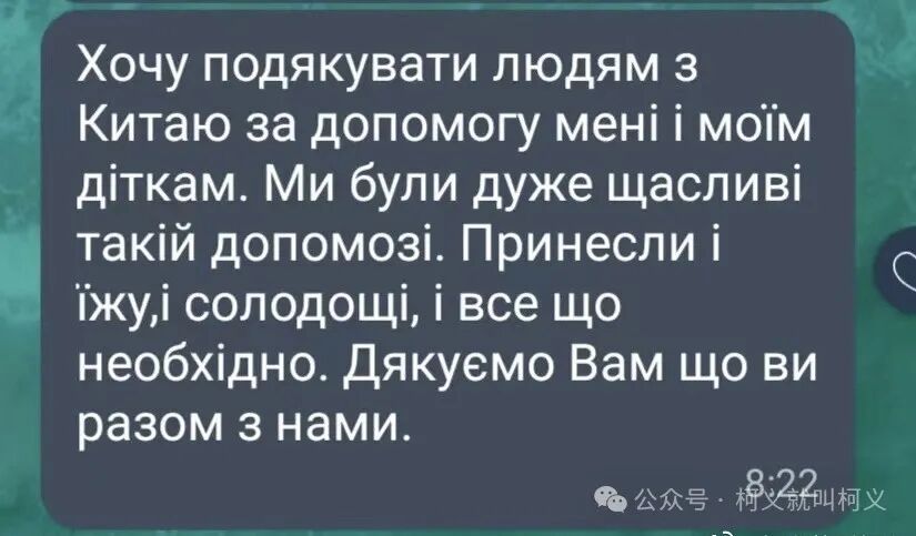 图4:我要感谢中国人帮助我和我的 孩子。 我们对这样的帮助 感到非常高兴。 他们 带来了食物、 糖果和一切必需品。 感谢您与我们在一起!图5:令人难以置信 的 是, 在中国 生活的人们是多么的善良。 他们正在努力帮助乌克兰人和赫尔松地区的人。 赫尔松的人们 在一场非常可怕的占领中幸存 下来, 没有电, 没有水, 又 冷又饿。 但是有像中国这样的人的支持我们不会消失。 非常 感谢, 你简直不可思议。 祝 您和您的家人健康、 幸福与平安。图6:非常感谢来自中国的人们。 “ 他们 给 我 带来了药和尿布湿。 它们太贵了, 我自己买不起。 谢谢你们!
