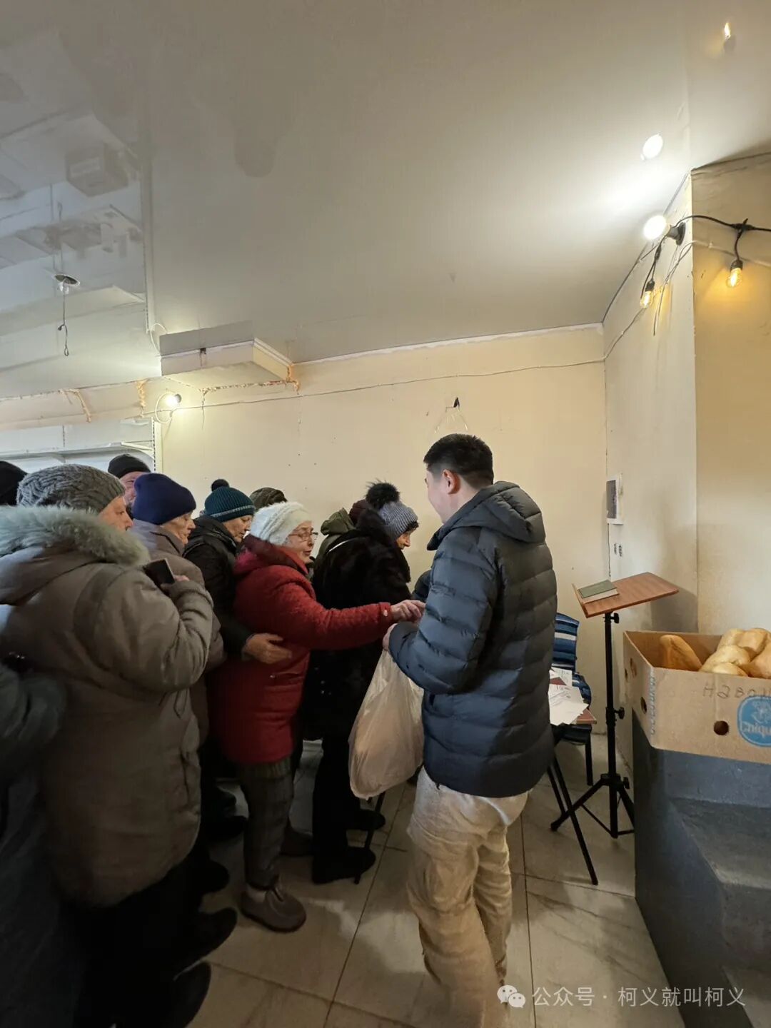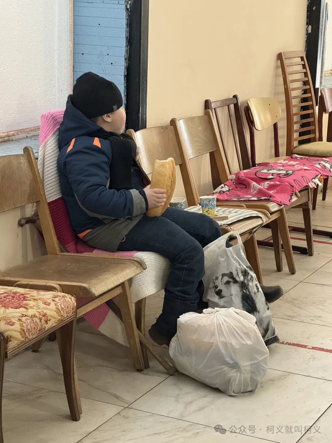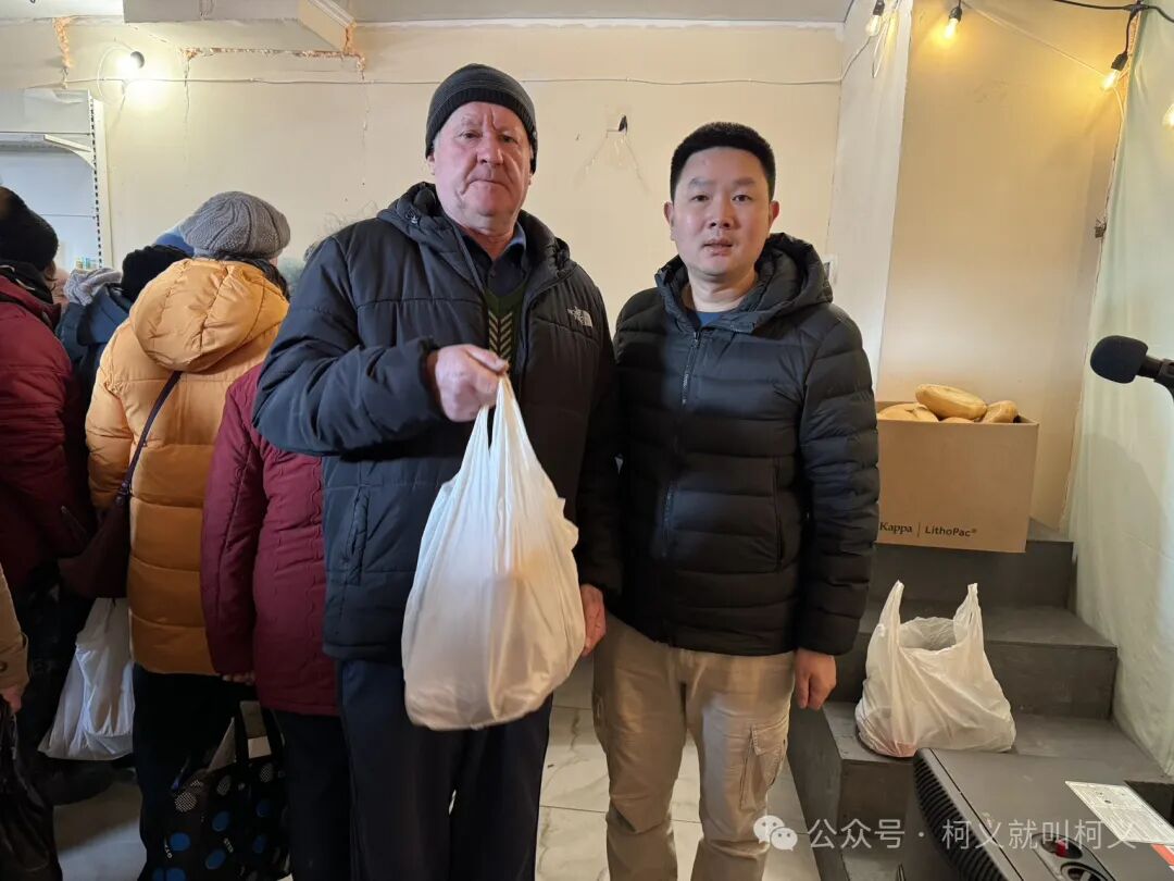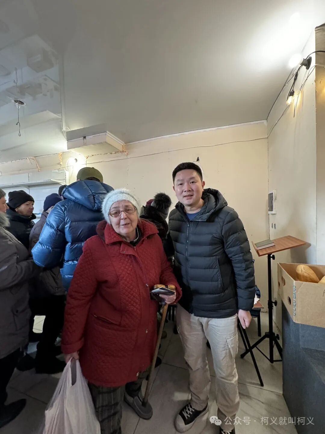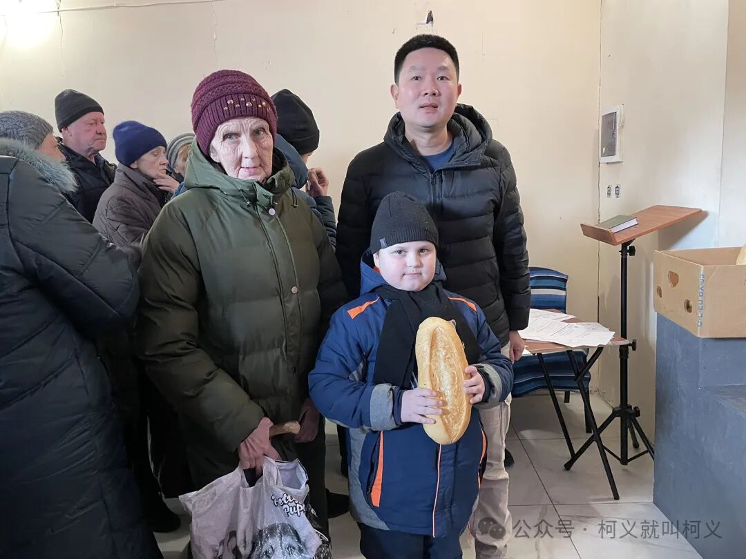 我会和每一个拿到食物袋的老人一起合影,我希望通过这样的方式告诉网友我没有辜负大家的期望,我是在努力的做事情,同时也方便我自己做记录,在这一群老人中我就看到了一个唯一的小朋友,一个小男孩和他奶奶,我问他叫什么名字几岁,但是没有问他家具体情况,担心会伤害到他,他叫Andrey,8岁,长的挺可爱的,小脸圆嘟嘟的,抱着面包就开始啃,那种面包比较结实是配汤一起吃的,还可以存放几天,后来问他喜不喜欢面包,他说喜欢,我特意多给了他四个。