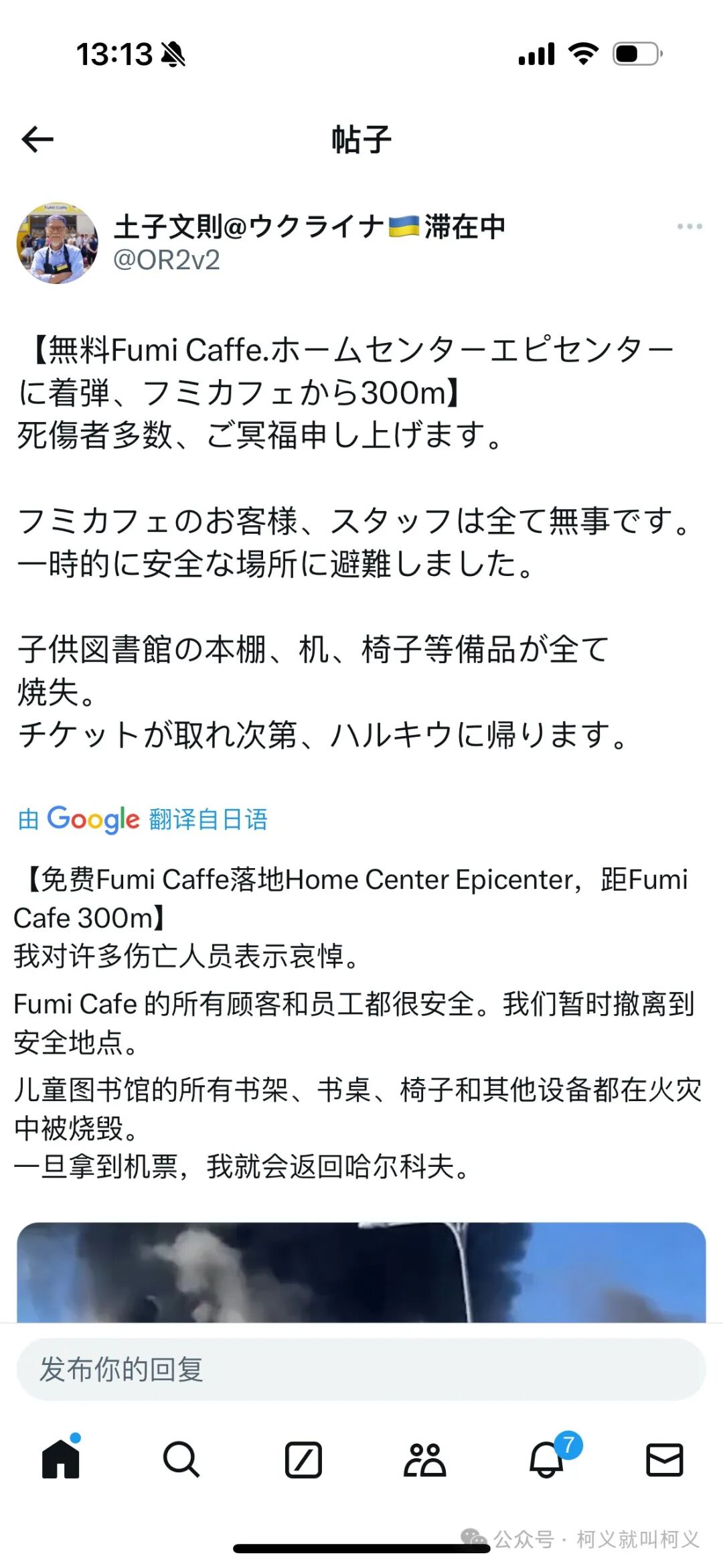 平时会有很多人去那边的露天菜市场购买蔬菜水果,更加让我担心的就是日本老大爷的慈善咖啡馆就在那里,他曾经告诉我一天会有一千人去那边领取免费的食物,我曾经也计划着在赫尔松也开一个类似这样的免费咖啡馆,但是因为战争的特殊性,没有办法在赫尔松那样战区的地方开展,而且日本老大爷的咖啡店真的被炸炸到了,我昨天找了一圈没有看到他在X上更新,今天早上看到了他在推特上发文,说窗户被炸了,儿童图书室桌子椅子都被烧毁了,看来他的咖啡店暂时工作不了,希望他的员工不要受伤,多灾多难的哈尔科夫市,也是让人伤心难过的一天。